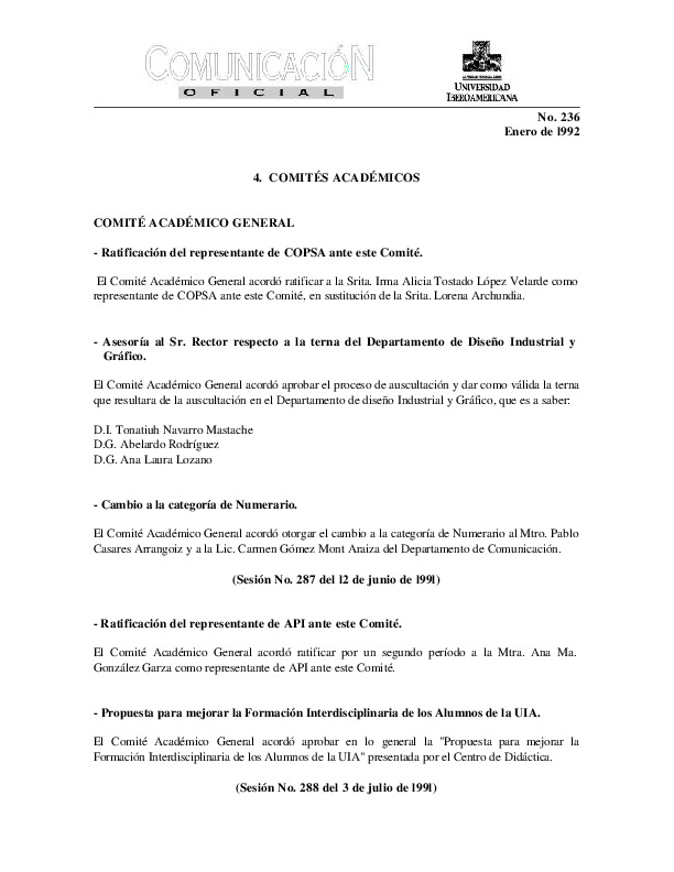 | Comunicación Oficial No. 236. 1 de enero de 1992 | Comunicación Oficial No. 236. 1 de enero de 1992 | | |