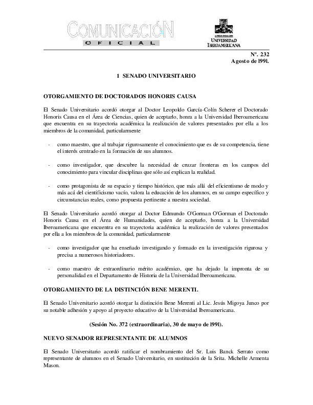 | Comunicación Oficial No. 232. 1 de agosto de 1991 | Comunicación Oficial No. 232. 1 de agosto de 1991 | | |