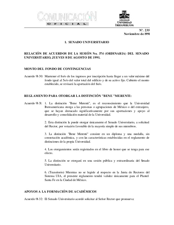 | Comunicación Oficial No. 235. 1 de noviembre de 1991 | Comunicación Oficial No. 235. 1 de noviembre de 1991 | | |