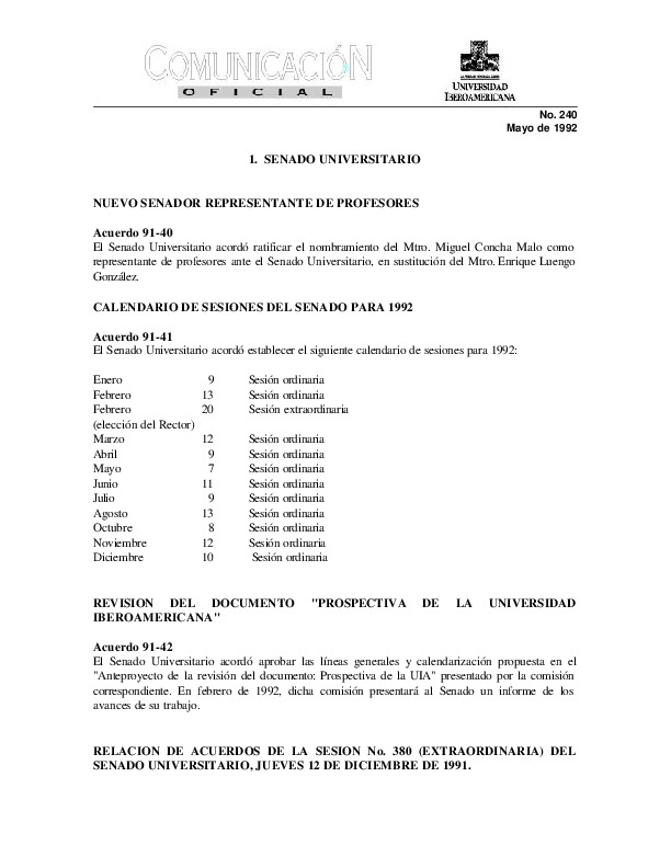| Comunicación Oficial No. 240. 1 de Mayo de 1992 | Comunicación Oficial No. 240. 1 de Mayo de 1992 | | |