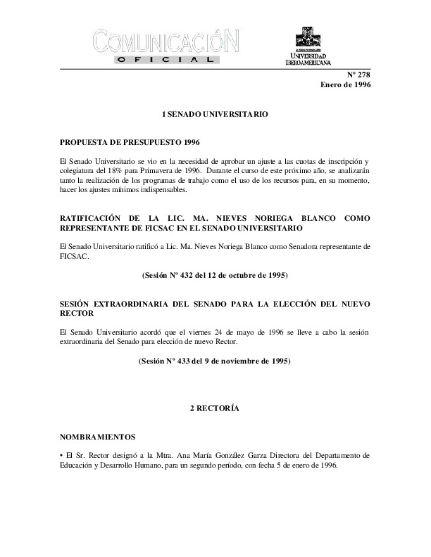 | Comunicación Oficial No. 278. 1 de enero de 1996 | Comunicación Oficial No. 278. 1 de enero de 1996 | | |