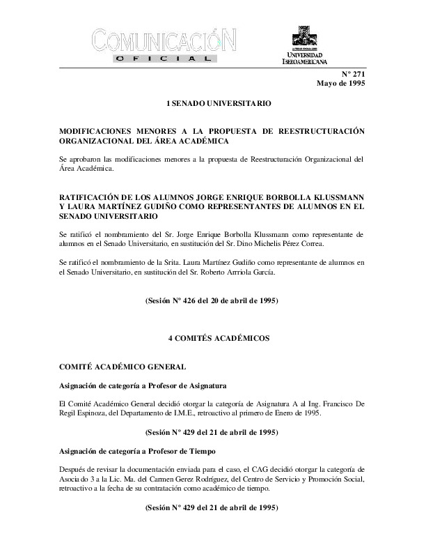 | Comunicación Oficial No. 271. 1 de mayo de 1995 | Comunicación Oficial No. 271. 1 de mayo de 1995 | | |