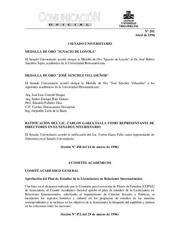 | Comunicación Oficial No. 281. 1 de abril de 1996 | Comunicación Oficial No. 281. 1 de abril de 1996 | | |