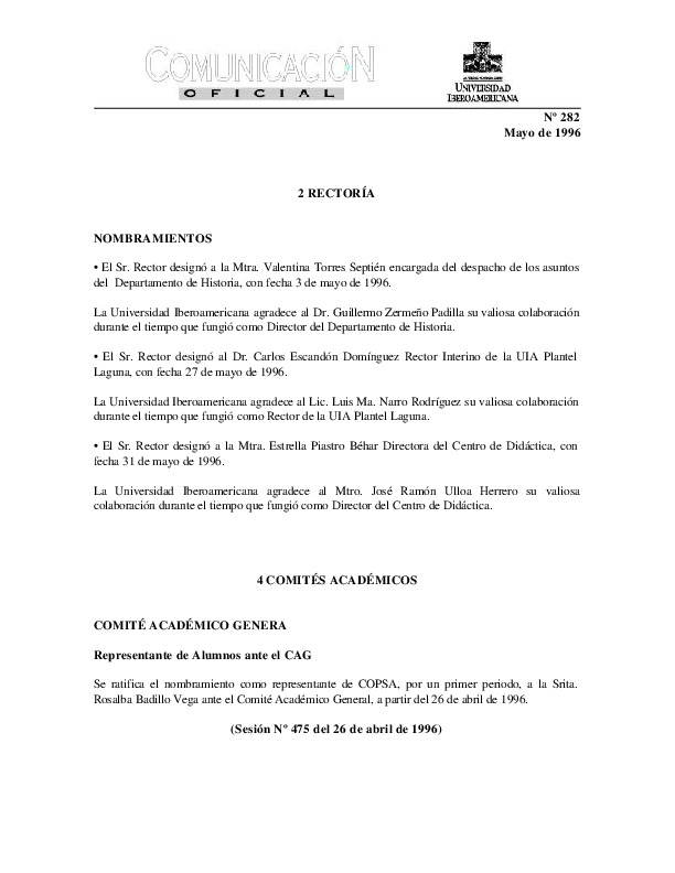 | Comunicación Oficial No. 282. 1 de mayo de 1996 | Comunicación Oficial No. 282. 1 de mayo de 1996 | | |