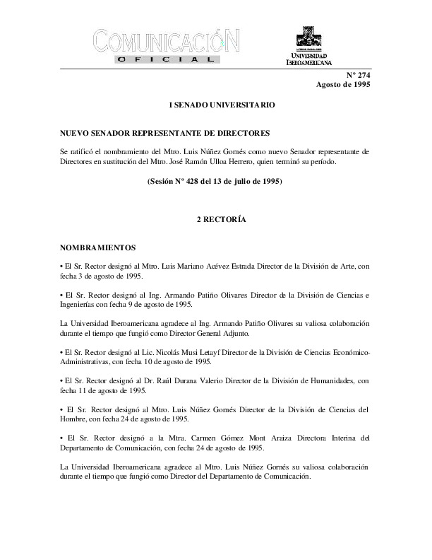| Comunicación Oficial No. 274. 1 de agosto de 1995 | Comunicación Oficial No. 274. 1 de agosto de 1995 | | |