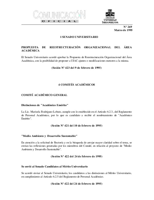 | Comunicación Oficial No. 269. 1 de marzo de 1995 | Comunicación Oficial No. 269. 1 de marzo de 1995 | | |