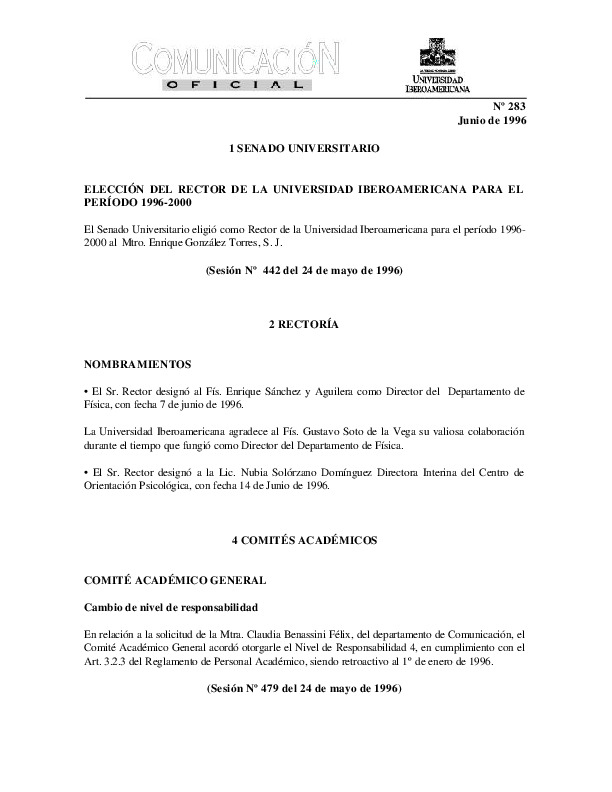 | Comunicación Oficial No. 283. 1 de junio de 1996 | Comunicación Oficial No. 283. 1 de junio de 1996 | | |