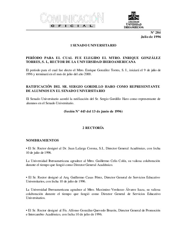 | Comunicación Oficial No. 284. 1 de julio de 1996 | Comunicación Oficial No. 284. 1 de julio de 1996 | | |