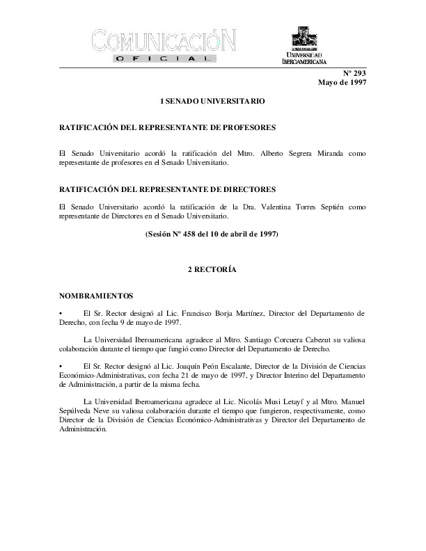 | Comunicación Oficial No. 293. 1 de mayo de 1997 | Comunicación Oficial No. 293. 1 de mayo de 1997 | | |