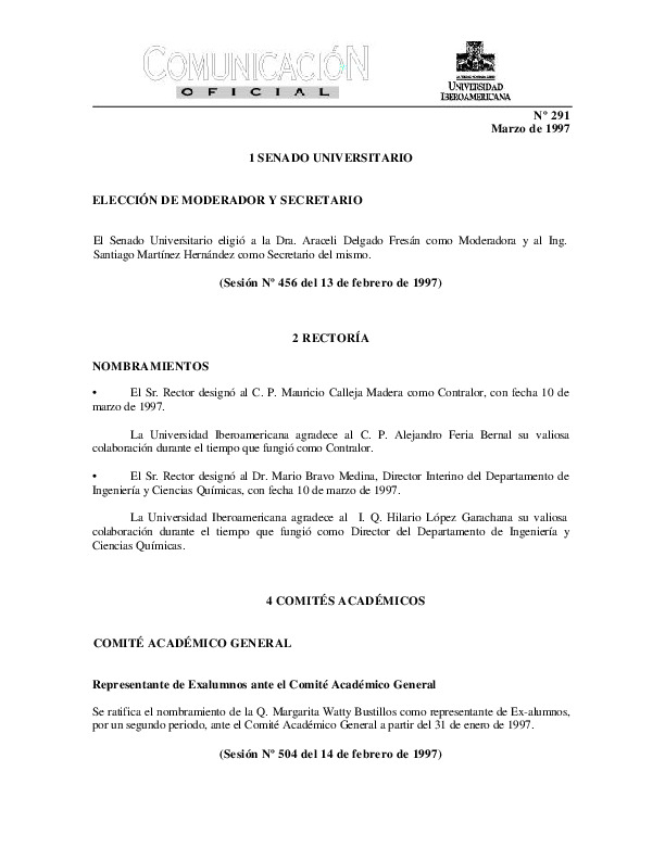 | Comunicación Oficial No. 291. 1 de marzo de 1997 | Comunicación Oficial No. 291. 1 de marzo de 1997 | | |