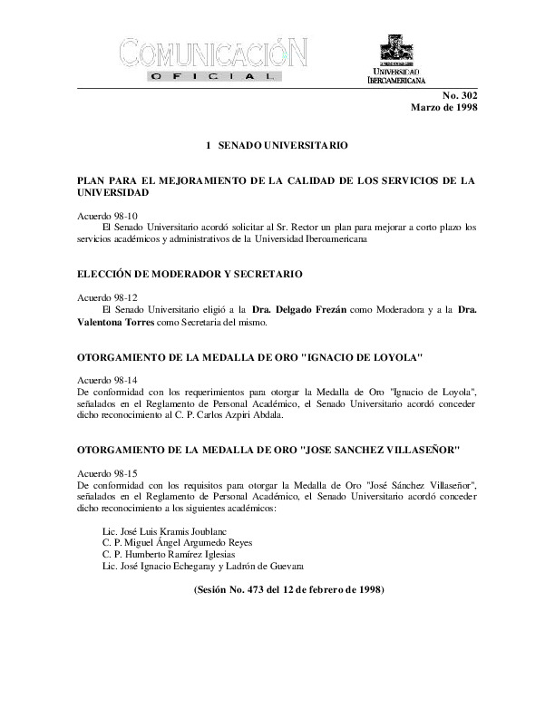 | Comunicación Oficial No. 302. 1 de marzo de 1998 | Comunicación Oficial No. 302. 1 de marzo de 1998 | | |
