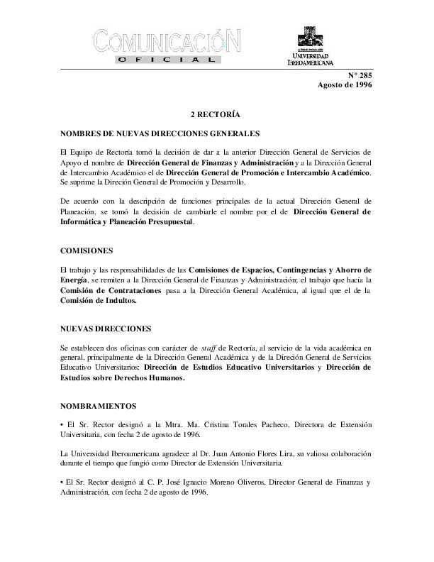 | Comunicación Oficial No. 285. 1 de agosto de 1996 | Comunicación Oficial No. 285. 1 de agosto de 1996 | | |
