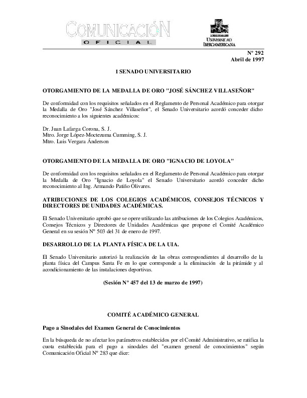 | Comunicación Oficial No. 292. 1 de abril de 1997 | Comunicación Oficial No. 292. 1 de abril de 1997 | | |
