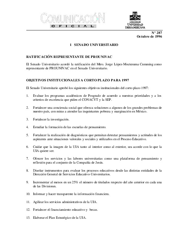 | Comunicación Oficial No. 287. 1 de octubre de 1996 | Comunicación Oficial No. 287. 1 de octubre de 1996 | | |