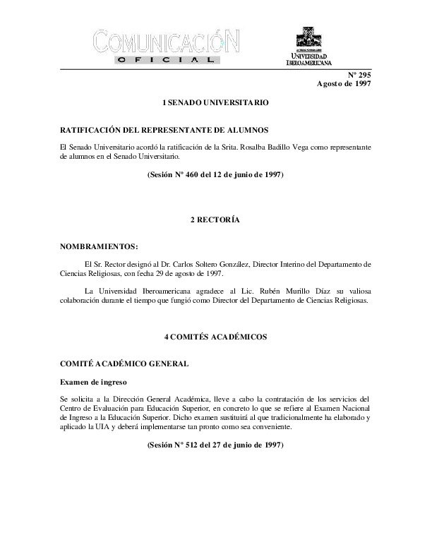 | Comunicación Oficial No. 295. 1 de agosto de 1997 | Comunicación Oficial No. 295. 1 de agosto de 1997 | | |