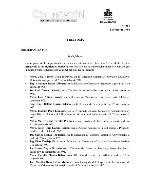 | Comunicación Oficial No. 301. 1 de febrero de 1998 | Comunicación Oficial No. 301. 1 de febrero de 1998 | | |