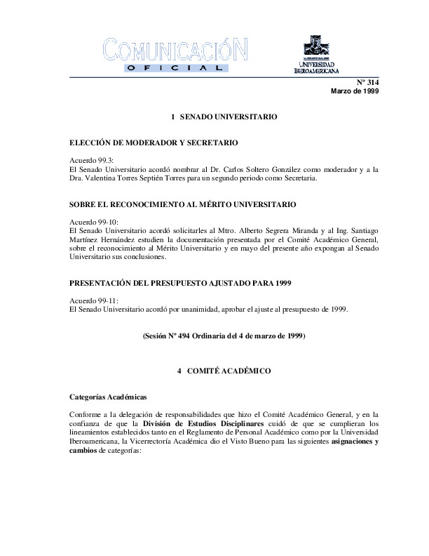| Comunicación Oficial No. 314. 1 de marzo de 1999 | Comunicación Oficial No. 314. 1 de marzo de 1999 | | |