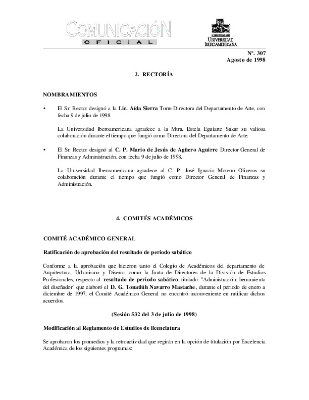 | Comunicación Oficial No. 307. 1 de agosto de 1998 | Comunicación Oficial No. 307. 1 de agosto de 1998 | | |