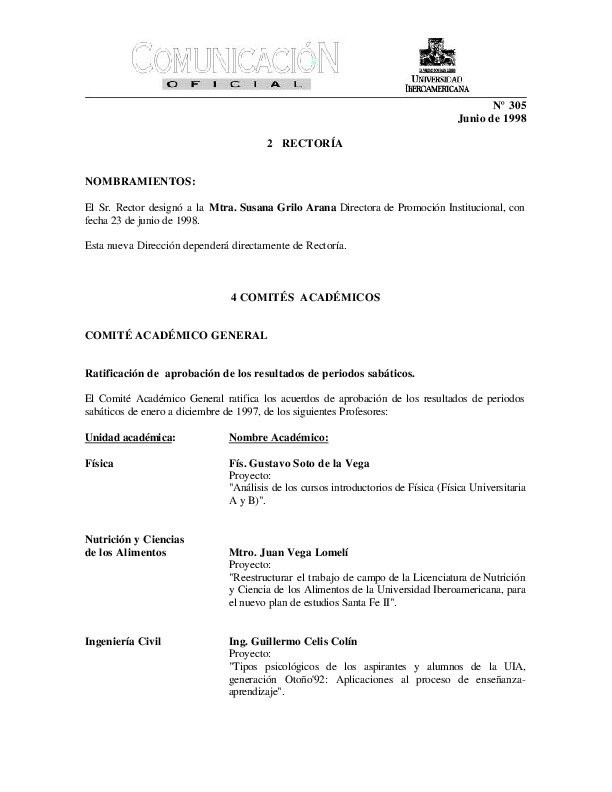 | Comunicación Oficial No. 305. 1 de junio de 1998 | Comunicación Oficial No. 305. 1 de junio de 1998 | | |