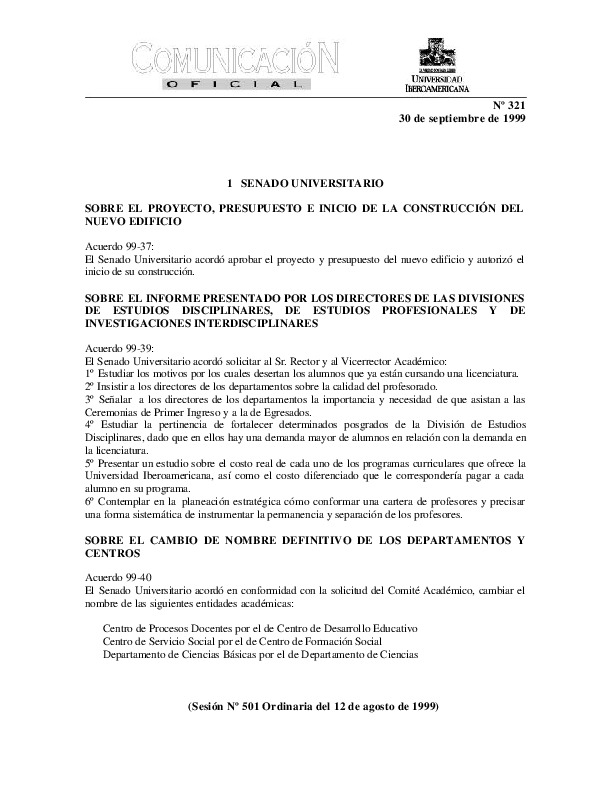 | Comunicación Oficial No. 321. 30 de septiembre de 1999 | Comunicación Oficial No. 321. 30 de septiembre de 1999 | | |
