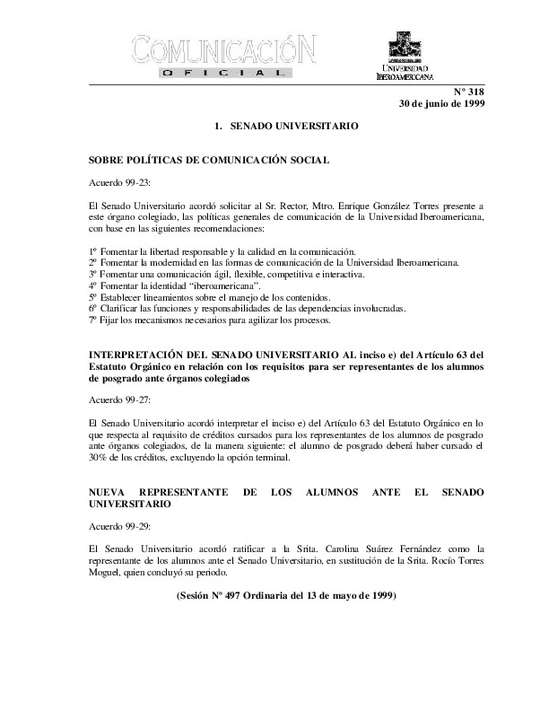 | Comunicación Oficial No. 318. 30 de junio de 1999 | Comunicación Oficial No. 318. 30 de junio de 1999 | | |