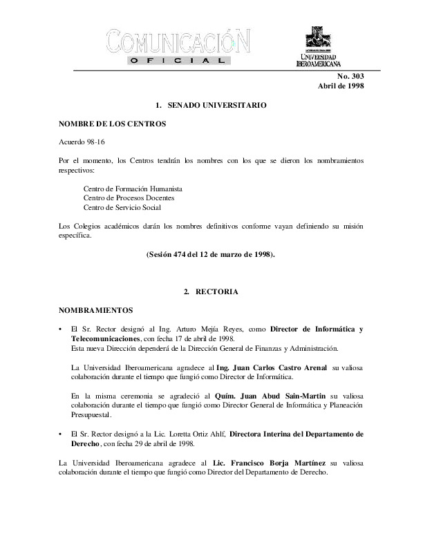 | Comunicación Oficial No. 303. 1 de abril de 1998 | Comunicación Oficial No. 303. 1 de abril de 1998 | | |