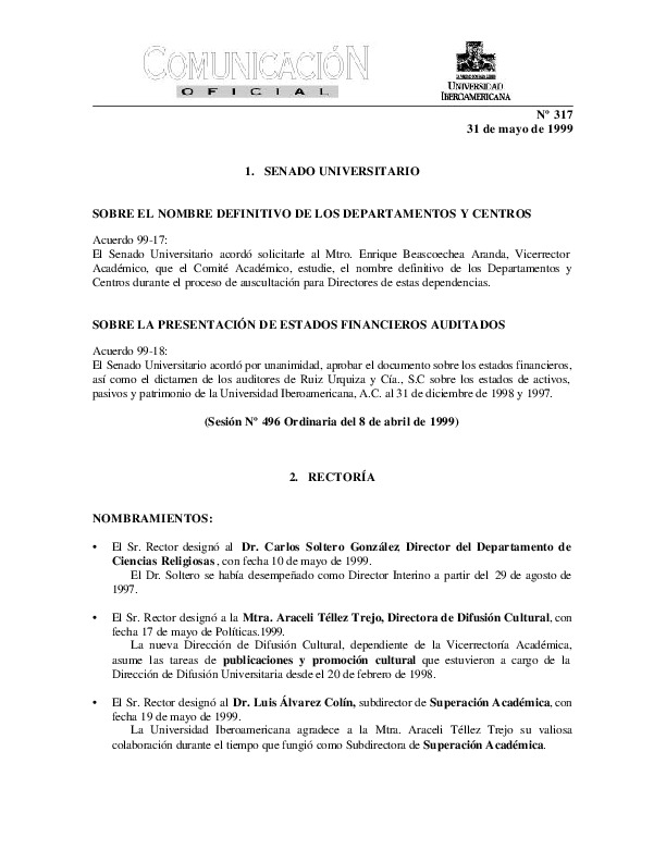 | Comunicación Oficial No. 317. 31 de mayo de 1999 | Comunicación Oficial No. 317. 31 de mayo de 1999 | | |