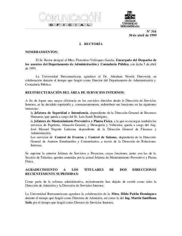 | Comunicación Oficial No. 316. 30 de abril de 1999 | Comunicación Oficial No. 316. 30 de abril de 1999 | | |
