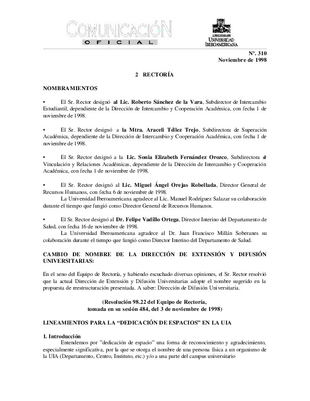 | Comunicación Oficial No. 310. 1 de noviembre de 1998 | Comunicación Oficial No. 310. 1 de noviembre de 1998 | | |