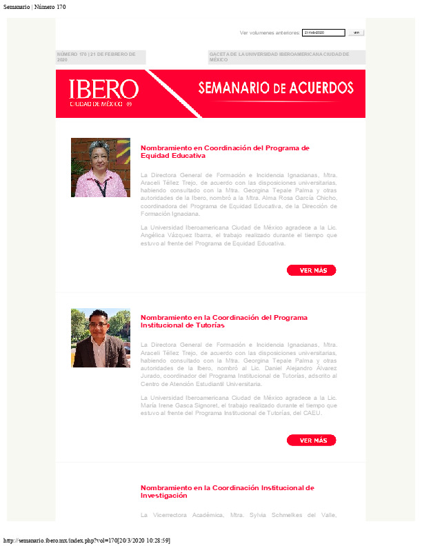 Semanario de Acuerdos (Universidad Iberoamericana Ciudad de México) Gaceta de la Universidad Iberoamericana Ciudad de México Nombramiento en la Coordinación de la Licenciatura en Actuaría Nombramiento en la Coordinación del Doctorado en Investigación Psicológica Nombramiento en la Coordinación de la Maestría en Seguridad Ciudadana y Acceso a la Justicia