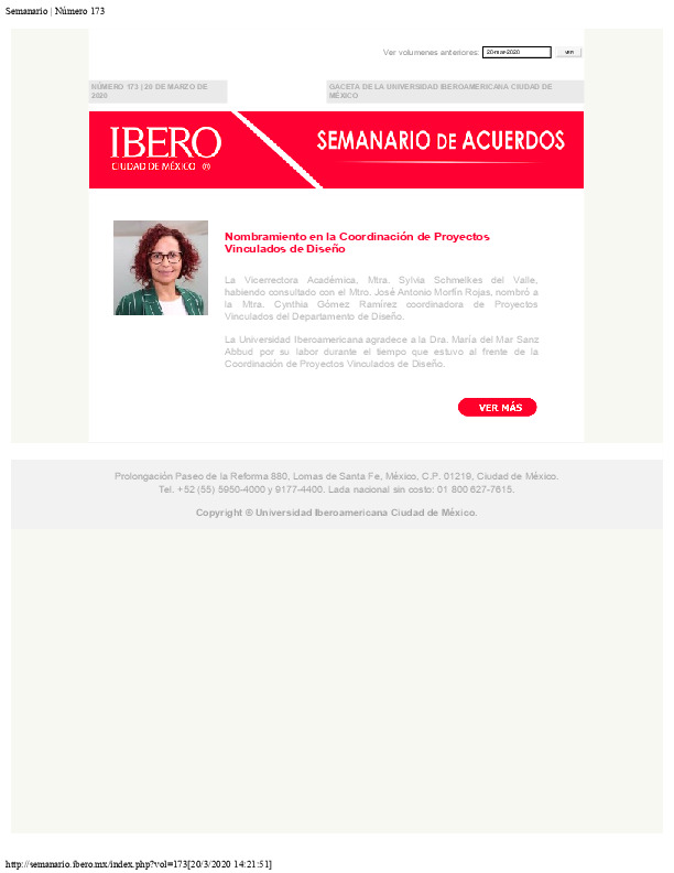 | Semanario de Acuerdos Número 173 | Semanario de Acuerdos Número 173 Semanario de Acuerdos (Universidad Iberoamericana Ciudad de México) Gaceta de la Universidad Iberoamericana Ciudad de México Nombramiento en la Coordinación de Proyectos Vinculados de Diseño |