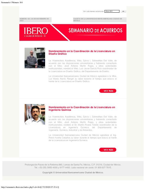 Semanario de Acuerdos (Universidad Iberoamericana Ciudad de México) Gaceta de la Universidad Iberoamericana Ciudad de México Nombramiento en la Coordinación de la Licenciatura en Diseño Gráfico Nombramiento en la Coordinación de la Licenciatura en Ingeniería Química