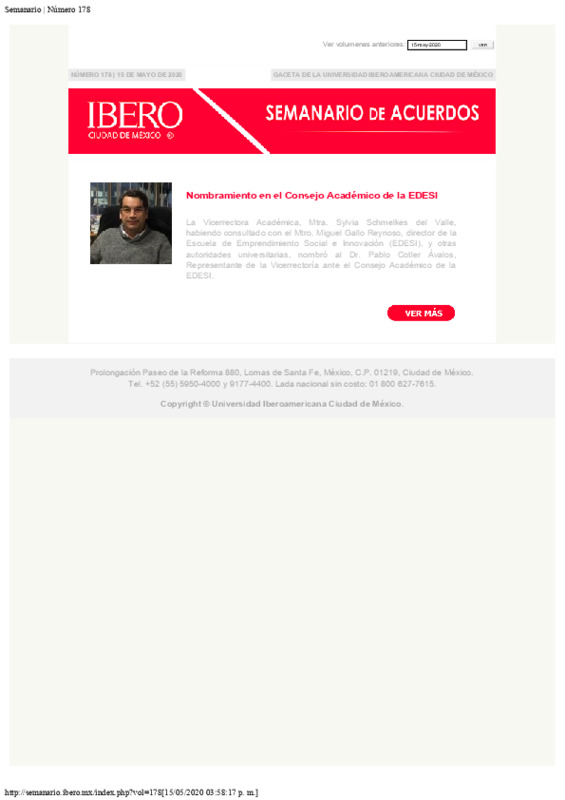 | Semanario de Acuerdos Número 178 | Semanario de Acuerdos Número 178 Semanario de Acuerdos (Universidad Iberoamericana Ciudad de México). Gaceta de la Universidad Iberoamericana Ciudad de México. Nombramiento en el Consejo Académico de la EDESI |