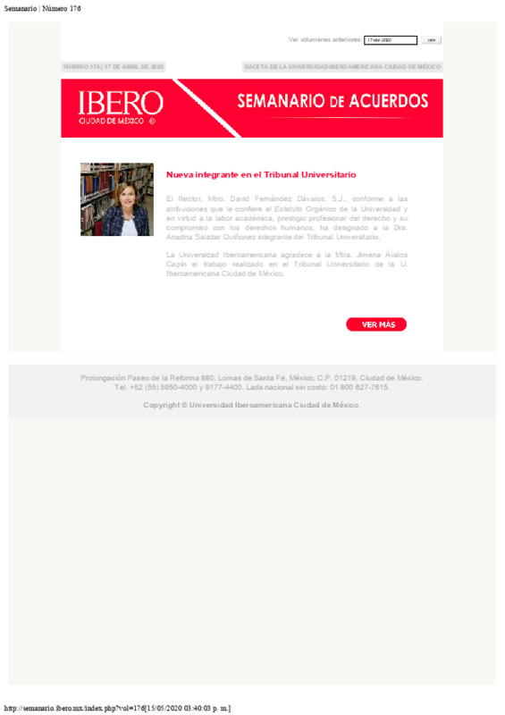 | Semanario de Acuerdos Número 176 | Semanario de Acuerdos Número 176 Semanario de Acuerdos (Universidad Iberoamericana Ciudad de México) Gaceta de la Universidad Iberoamericana Ciudad de México Nueva integrante en el Tribunal Universitario |