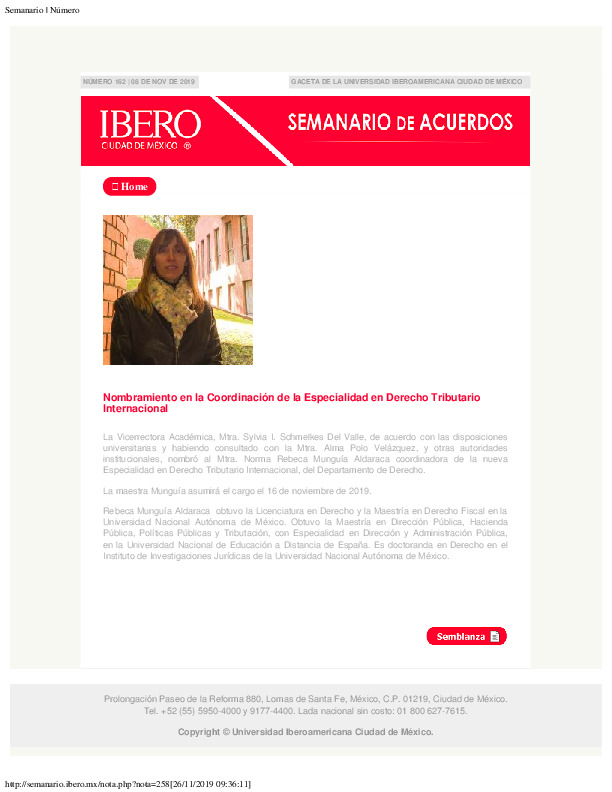 Semanario de Acuerdos (Universidad Iberoamericana Ciudad de México) Gaceta de la Universidad Iberoamericana Ciudad de México Nombramiento en la Coordinación de la Especialidad en Derecho Tributario Internacional