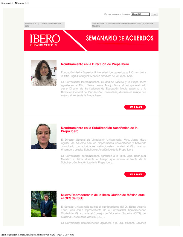 Semanario de Acuerdos (Universidad Iberoamericana Ciudad de México) Gaceta de la Universidad Iberoamericana Ciudad de México Nombramiento en la Dirección de Prepa Ibero Nombramiento en la Subdirección Académica de la Prepa Ibero Nuevo Representante de la Ibero Ciudad de México ante el CES del SUJ