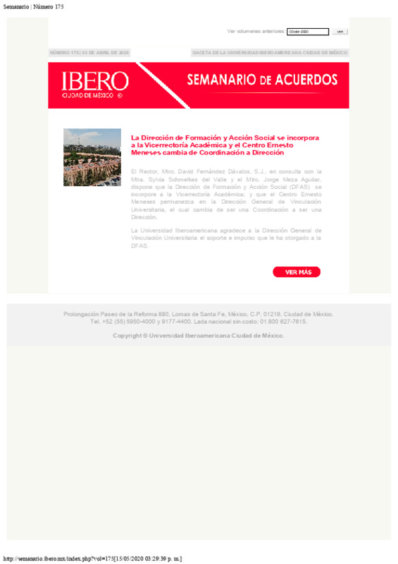 | Semanario de Acuerdos Número 175 | Semanario de Acuerdos Número 175 Semanario de Acuerdos (Universidad Iberoamericana Ciudad de México). Gaceta de la Universidad Iberoamericana Ciudad de México. La Dirección de Formación y Acción Social se incorpora a la Vicerrectoría Académica y el Centro Ernesto Meneses cambia de Coordinación a Dirección |