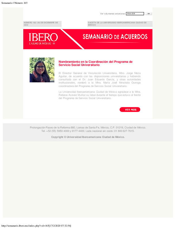 | Semanario de Acuerdos Número 165 | Semanario de Acuerdos Número 165 Semanario de Acuerdos (Universidad Iberoamericana Ciudad de México) Nombramiento en la Coordinación del Programa de Servicio Social Universitario |